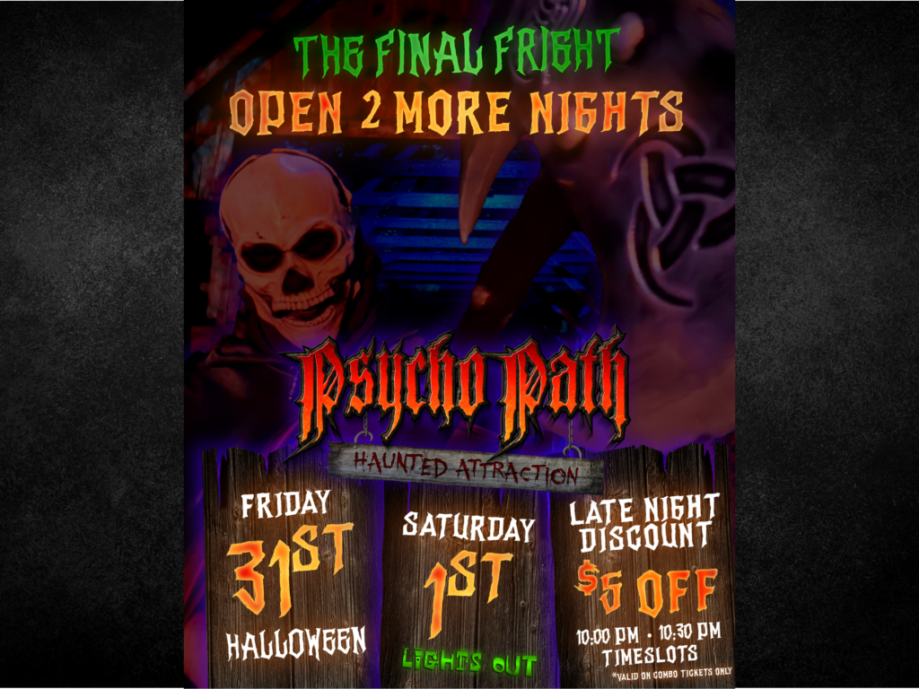 Developed a consistent stream of branded creative for Psycho Path’s seasonal marketing, event promotion, merch drops, and social channels. The work helped keep the attraction visually active across the haunt season while giving the team flexible assets for announcements, ticket pushes, special events, and audience engagement.